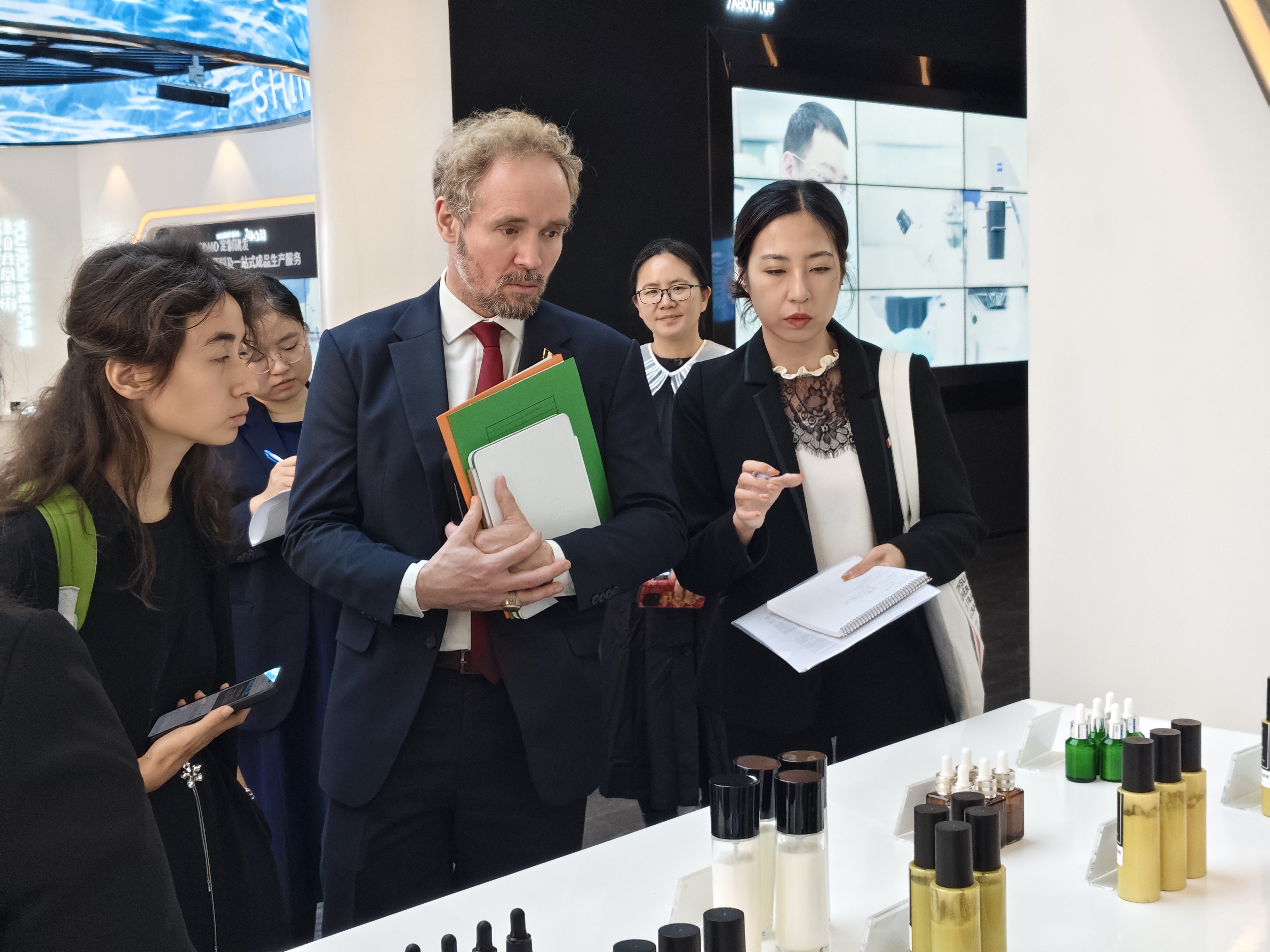 在企业负责人的引导下,外宾团先后参观了公司生产车间、研发实验室及成果展示区,详细了解企业依托超分子核心技术,在健康产品研发、生产、销售等领域的发展成果。参访过程中,双方围绕中法健康产业合作、技术创新交流、市场资源对接等话题展开深入交流。