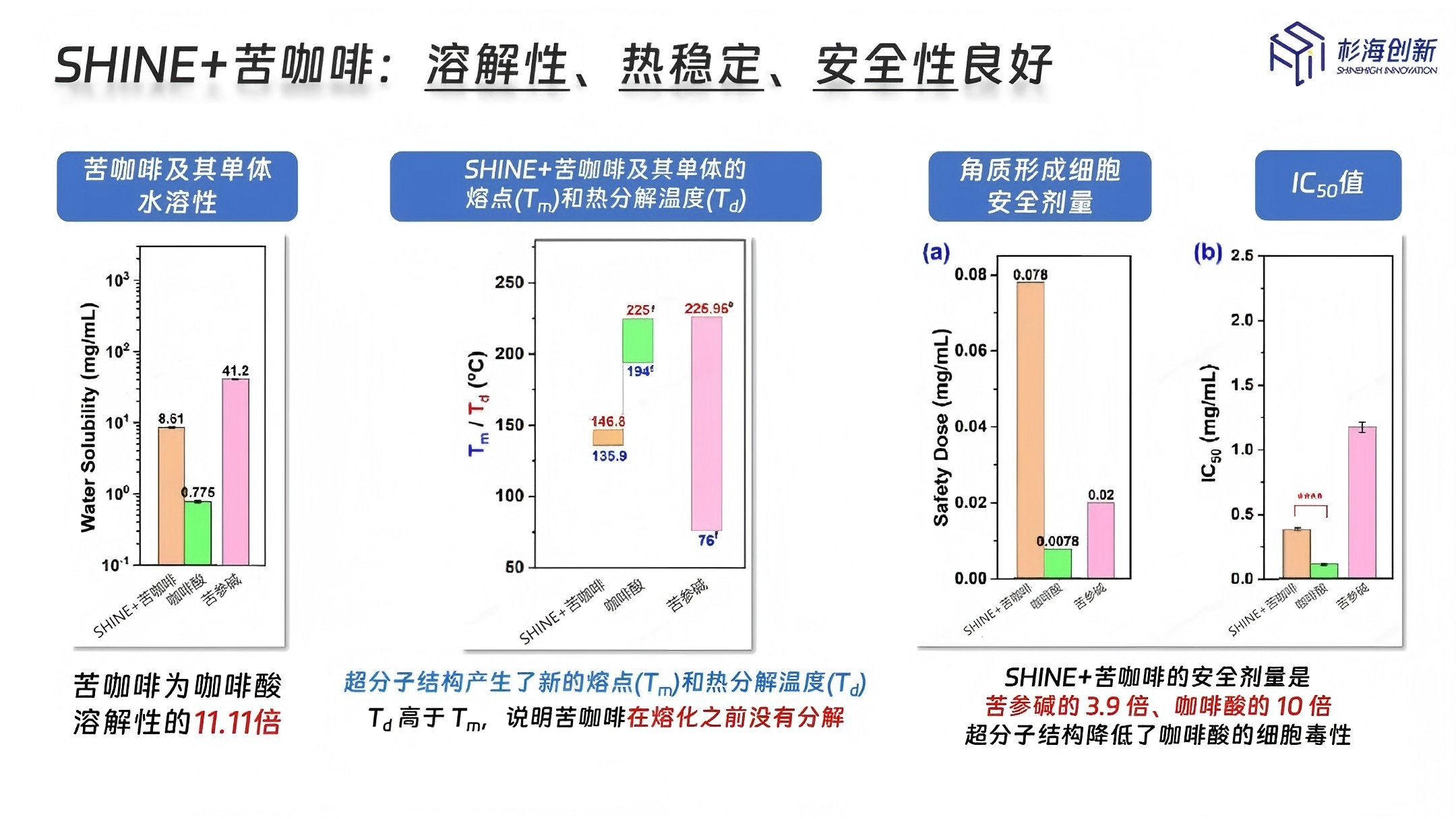 经过科学验证表明,SHINE+苦咖啡完全保留了两种成分的主体分子骨架及官能团,换言之,其同时具备着苦参碱、咖啡酸的生物活性和功效作用,协同发挥出良好的抗氧化、抗炎与抗菌效用。鉴于苦参碱本身拥有与咖啡酸相似的抗炎和抗菌特性,超分子结构下进一步增强了这些功效。此外,与两者单体相比,SHINE+苦咖啡还表现出更低的刺激性(安全剂量是苦参碱的 3.9 倍、咖啡酸的 10 倍)、优越的热稳定性,确保了它的安全温和。