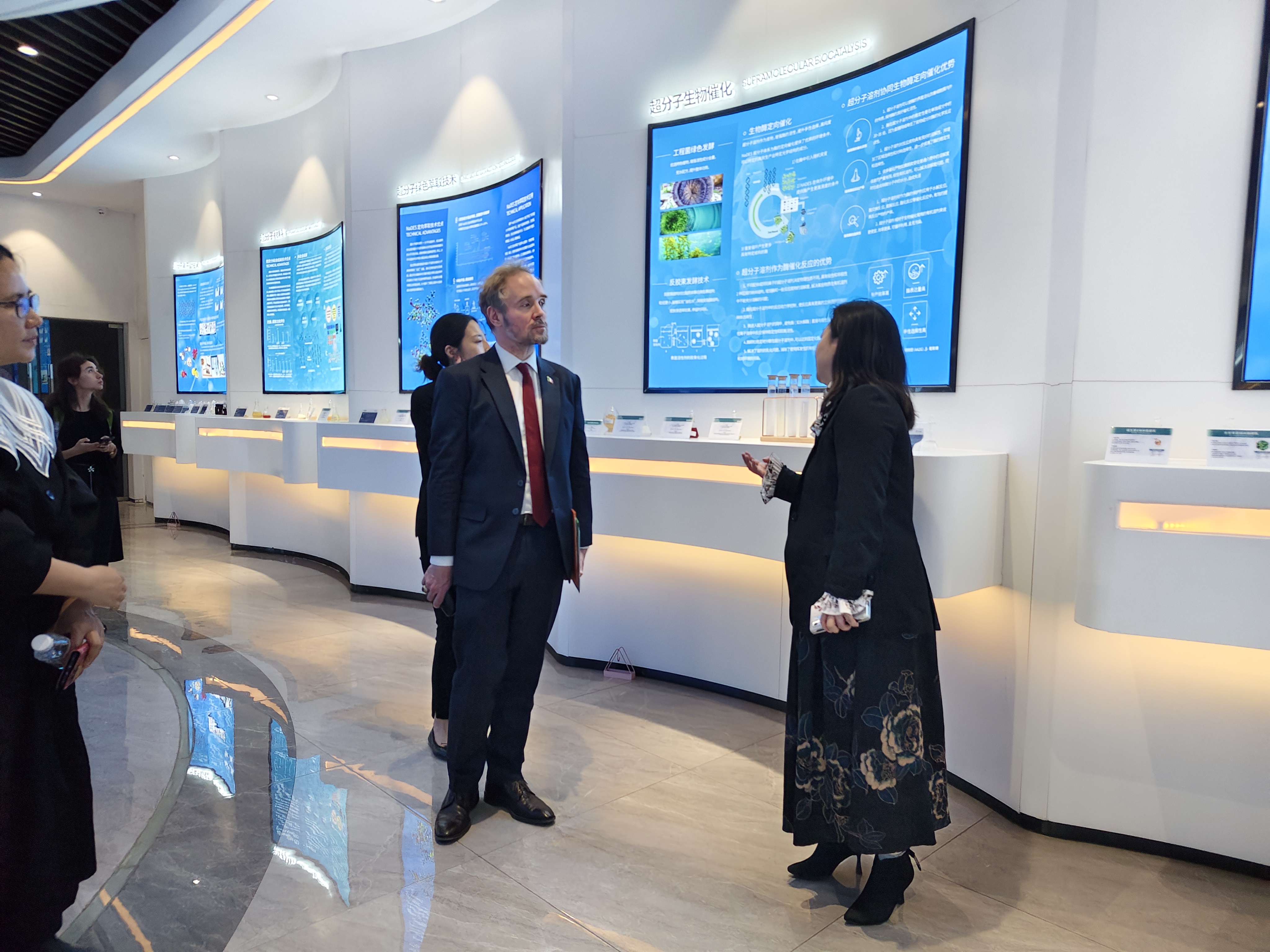 在企业负责人的引导下,外宾团先后参观了公司生产车间、研发实验室及成果展示区,详细了解企业依托超分子核心技术,在健康产品研发、生产、销售等领域的发展成果。参访过程中,双方围绕中法健康产业合作、技术创新交流、市场资源对接等话题展开深入交流。